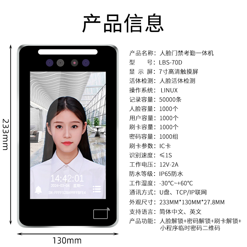 蓝博森LBS-70D 人脸考勤门禁一体机 价格: 编号:蓝博森LBS-70D